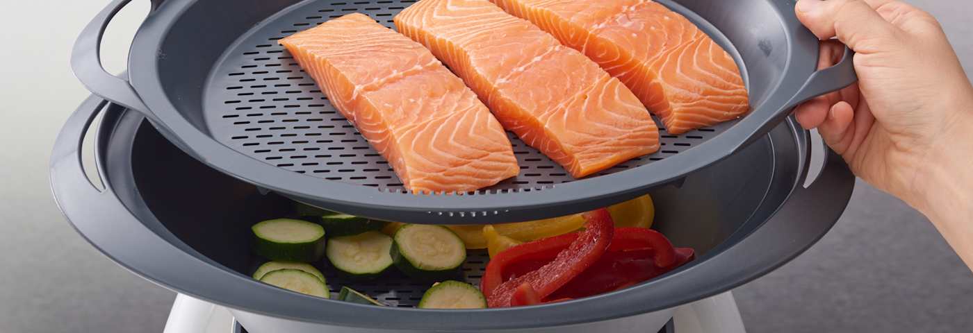 使用美善品®的蒸锅和蒸盘,可以方便进行一锅多菜的烹饪。在主锅中制作水份含量较大的主菜或者汤品,在蒸锅组中烹饪鱼类和海鲜,只需简单的用你喜欢的调味料腌制一下即可开始蒸煮。