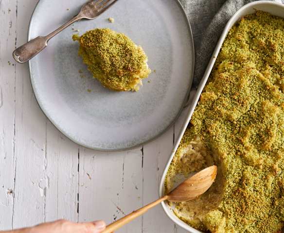 Bacalhau com feijão e grelos com crosta de broa e batatas no forno