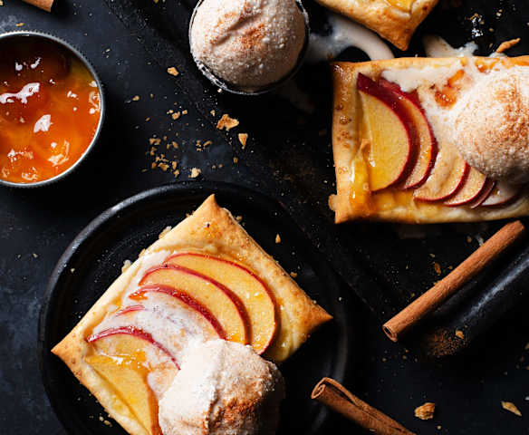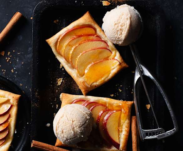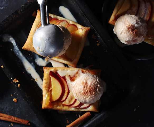 Helado de canela y yogur sobre hojaldre con manzana