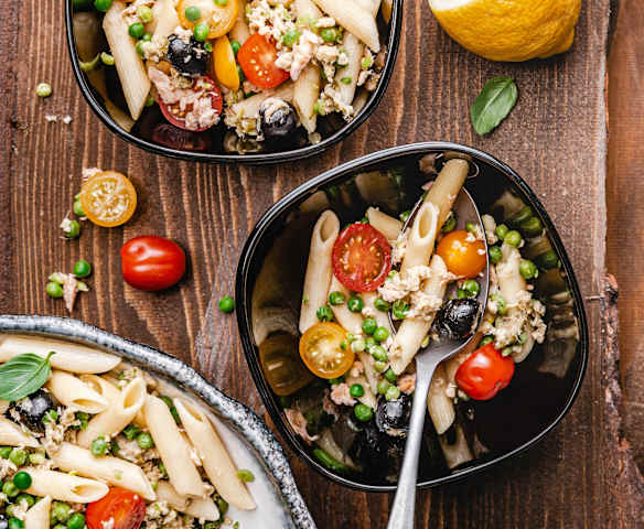 Ensalada de pasta con trucha y verduras
