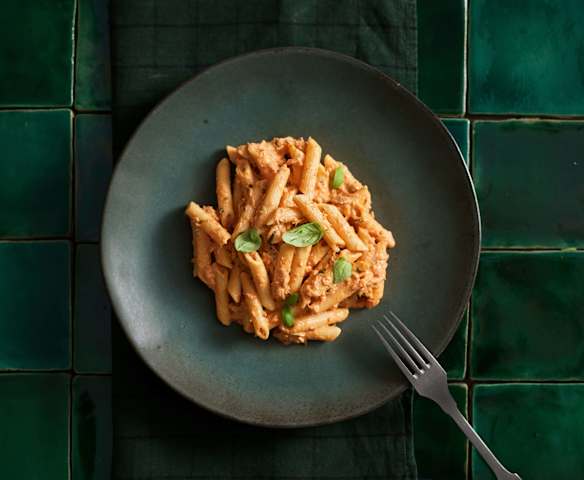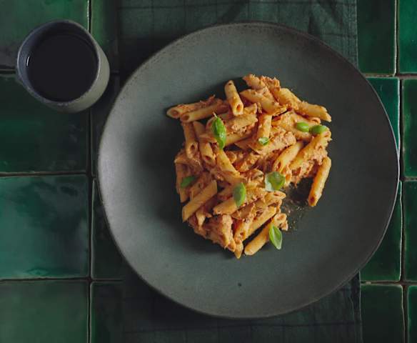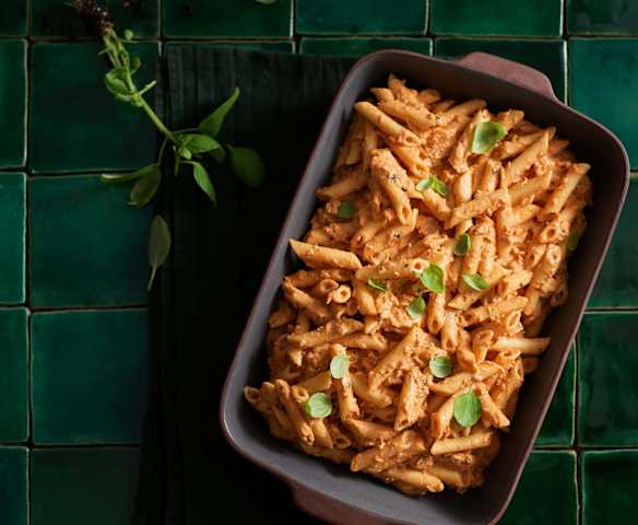 Massa à italiana com pesto e tomate-cereja confitado (vegetariana)