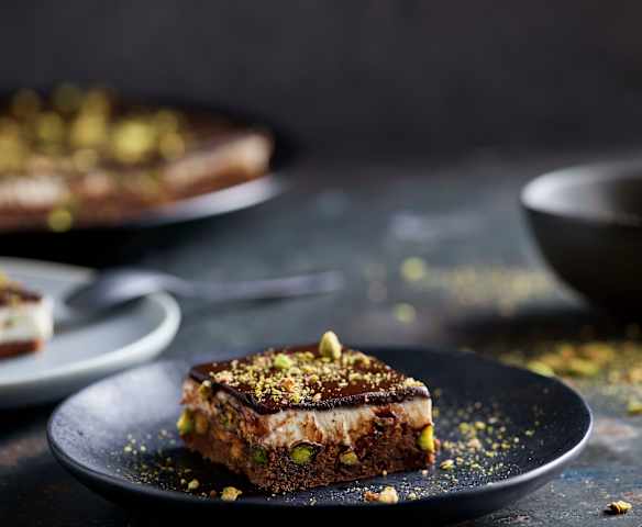 Brownie z kremem pistacjowym i kakaową glazurą