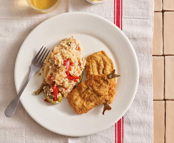 Bacalhau com feijão e grelos com crosta de broa e batatas no forno