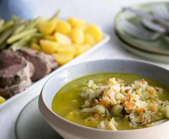 Zupa kalafiorowa i pulpety drobiowe w sosie chrzanowym z warzywami na parze