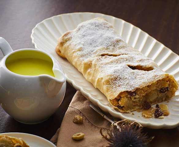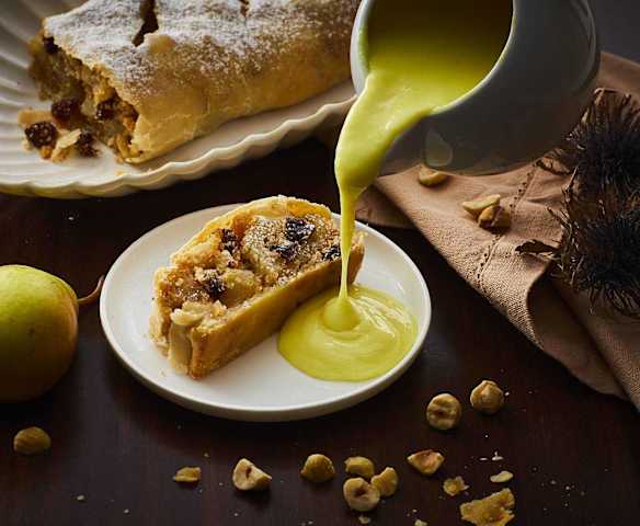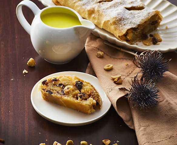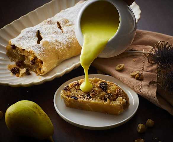 Strüdel alle pere e nocciole con salsa alla vaniglia (vegan)