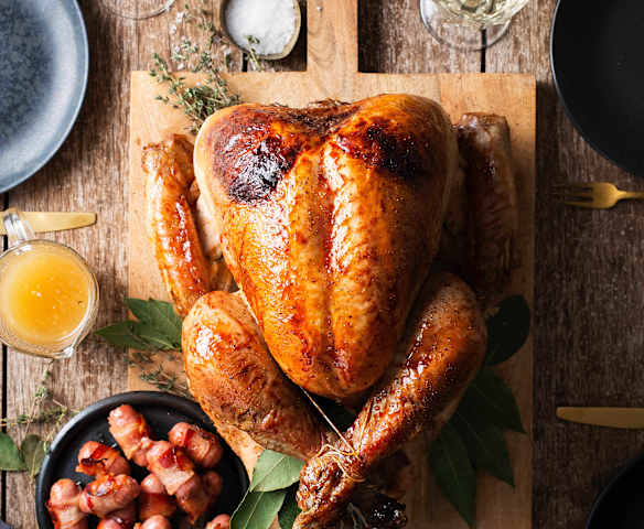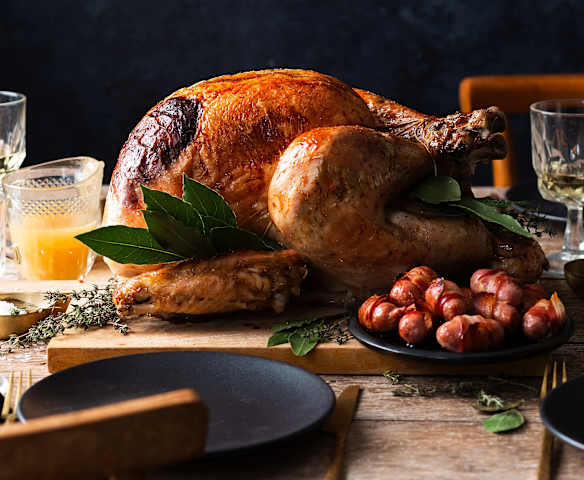 Dinde rôtie, farce crémeuse à la pancetta, au citron et aux herbes
