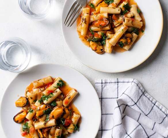 Rajčatovo-česnekové těstoviny s mušlemi z jednoho hrnce