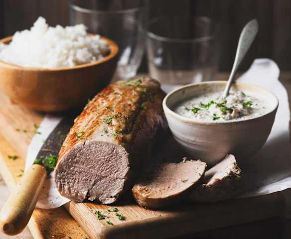 Pečená vepřová panenka s rýží a houbovou omáčkou