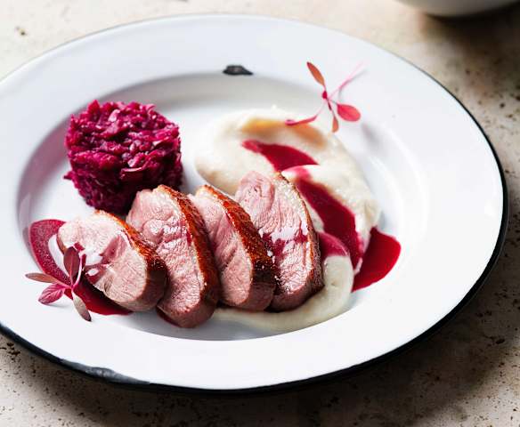 Piersi z kaczki (sous-vide, z osłoną noża miksującego) z kiszoną czerwoną kapustą i purée z selera