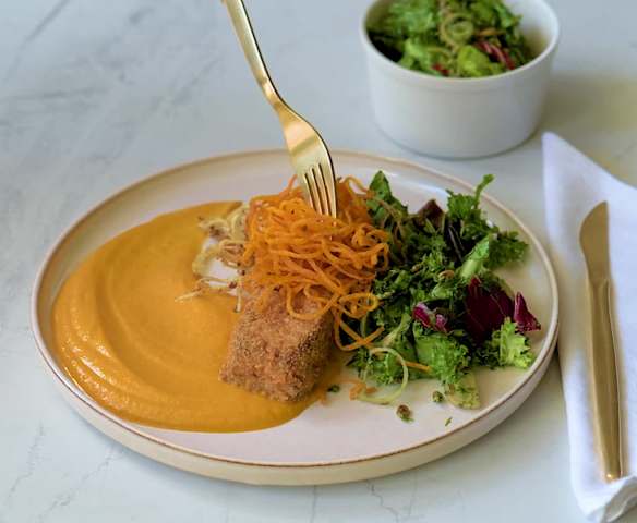 Tofu w stylu japońskim, sos dyniowy, spiralizowane frytki