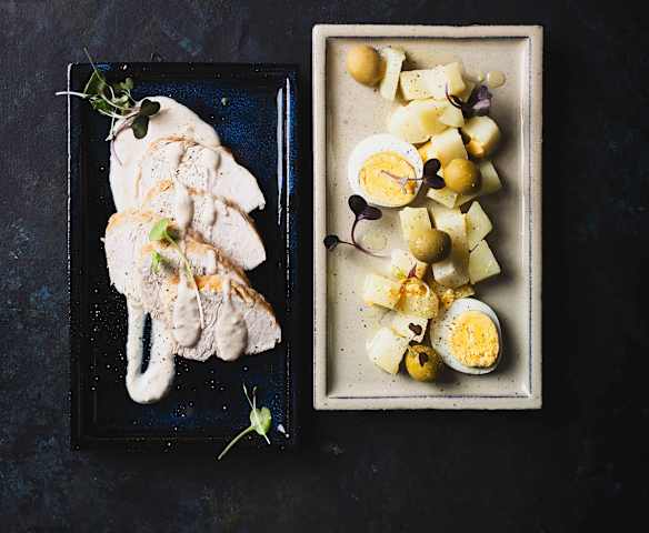 Menú para dos: Pollo a la provenzal con patatas. Pudin de chocolate