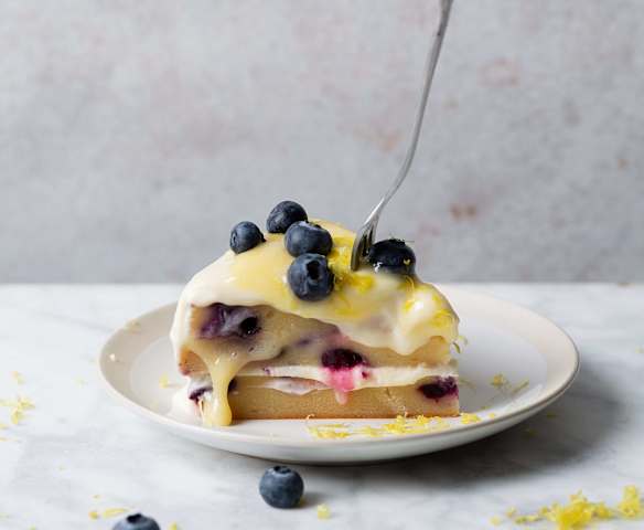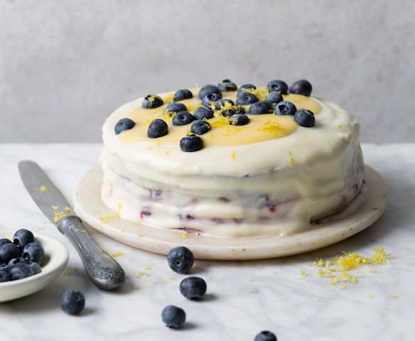 Bolo de mirtilo com cobertura de queijo-creme e lemon curd
