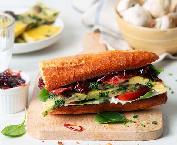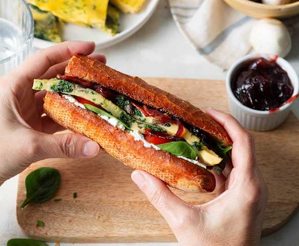 Sendvič s frittatou, kozím sýrem a čatním z červené cibule
