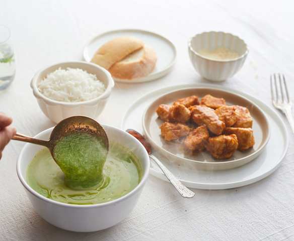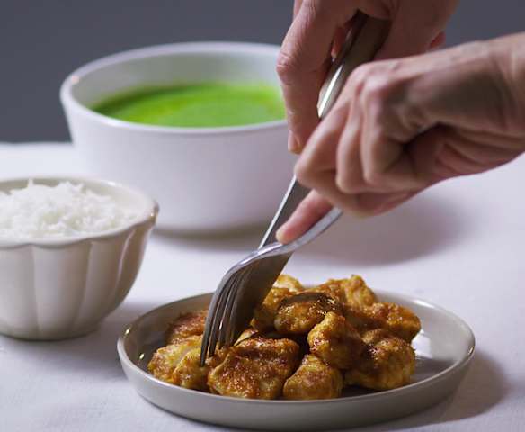Bocconcini di pollo con crema di zucchine e riso basmati
