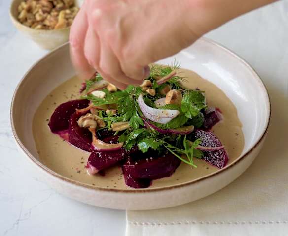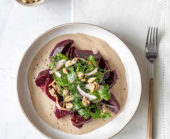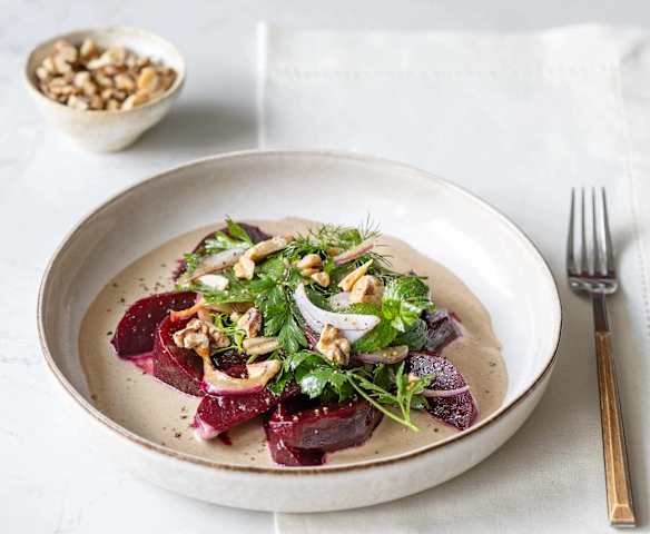 Buraki z orzechowym sosem miso i sałatką z ziół