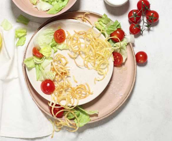 Kebabs de pollo picante con papas curly y ensalada