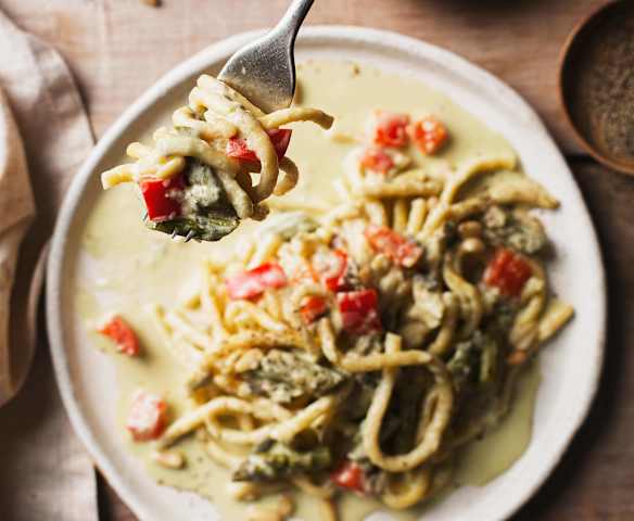 Tăiței spätzle cu sparanghel și sos de smântănă cu leurdă