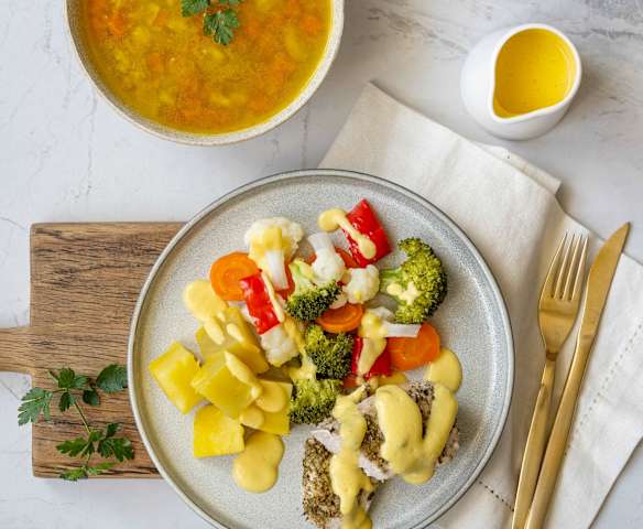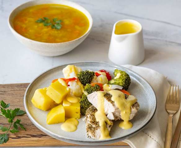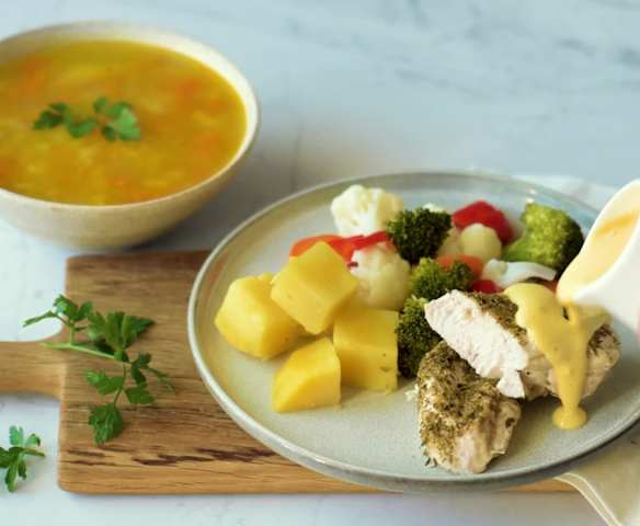 Zupa warzywna, kurczak w sosie musztardowo-śmietanowym