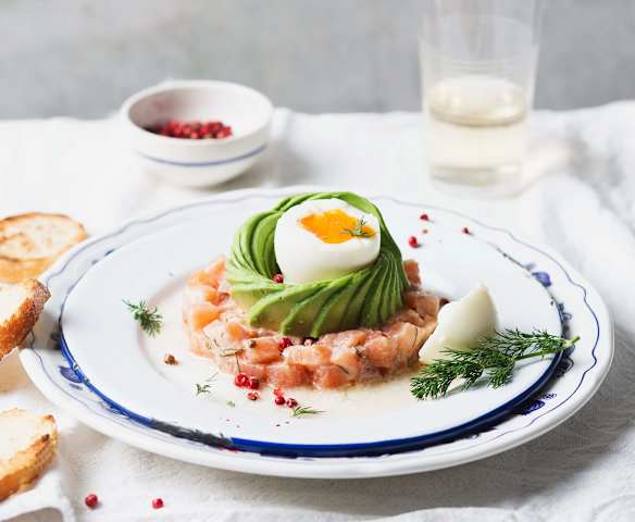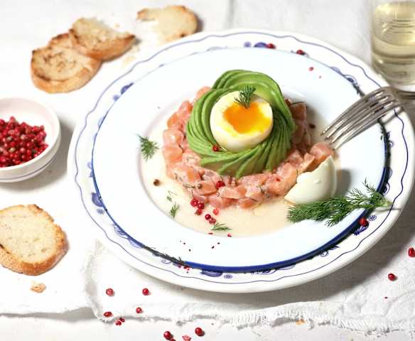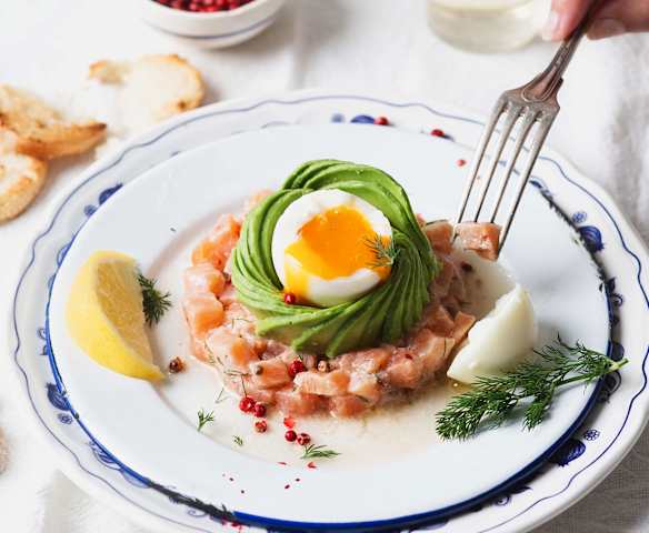 Tartar de salmón con aguacate y huevo mollet