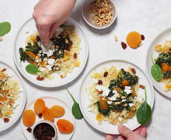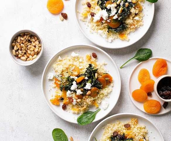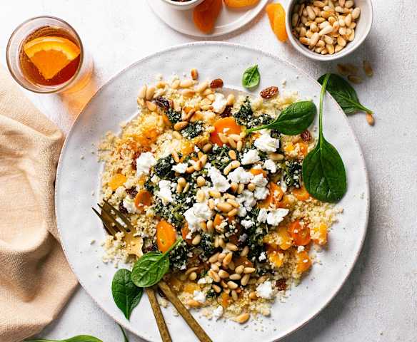 Cuscús con albaricoques, avellanas y queso feta con verduras