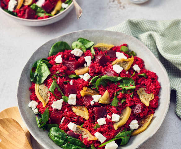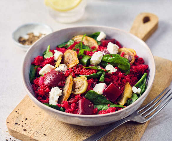 Rote-Bete-Couscoussalat mit gebratenen Maultaschen