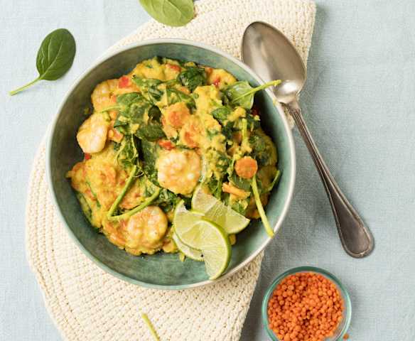 Dhal z soczewicy ze szpinakiem i krewetkami