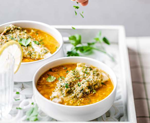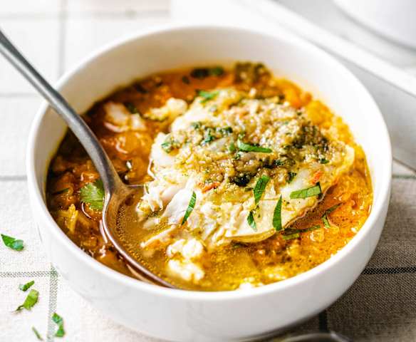 Cabillaud mariné aux herbes et son bouillon