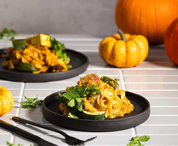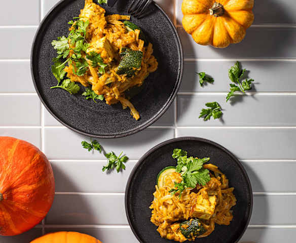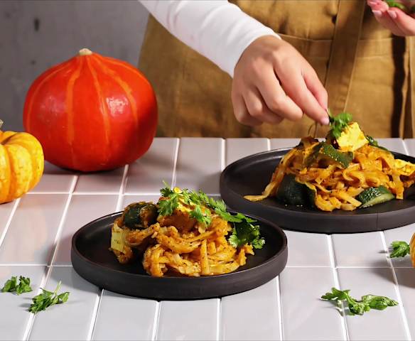Makaron ryżowy z lekkim sosem dyniowym i tofu