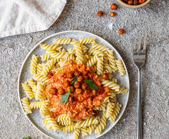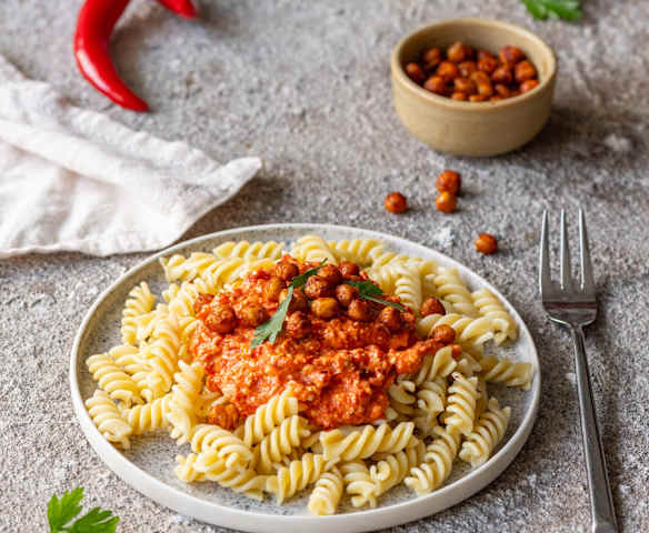 Makaron z paprykowym sosem i chrupiącą ciecierzycą