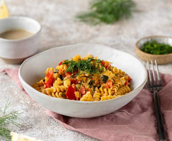 Makaron z ciecierzycy z warzywami w sosie tahini