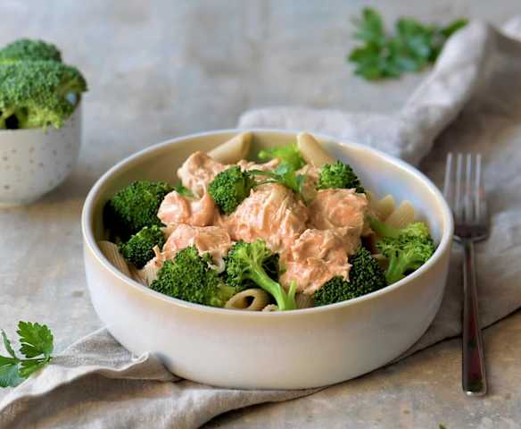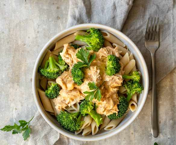 Makaron z brokułami i kurczakiem w sosie orzechowym