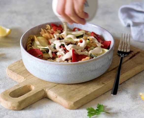 Makaron z soczewicy z pieczonymi warzywami i tahini