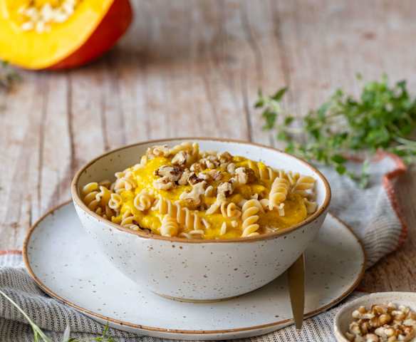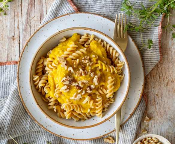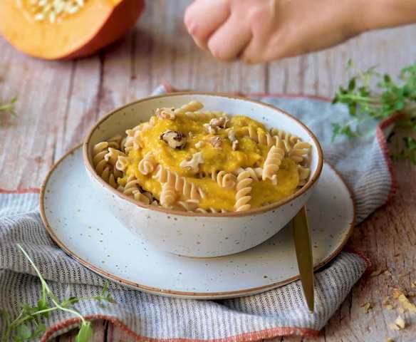 Makaron z ciecierzycy z sosem dyniowym z fetą