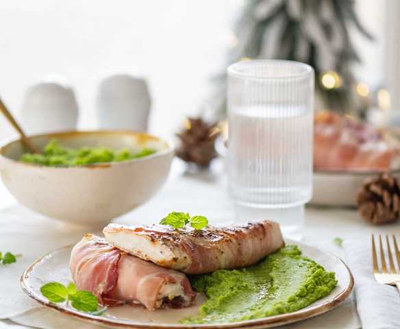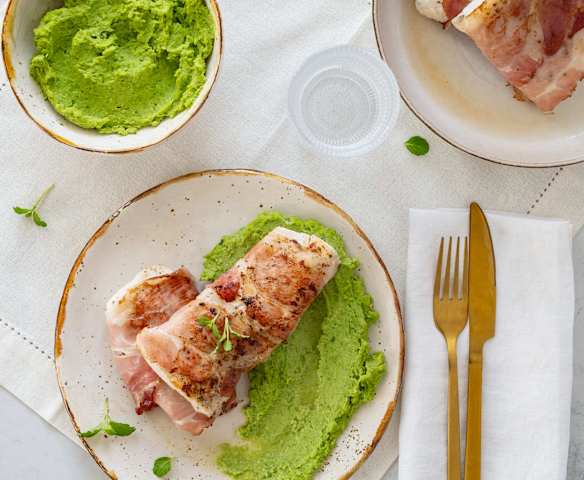 Dorsz w szynce parmeńskiej z purée z groszku