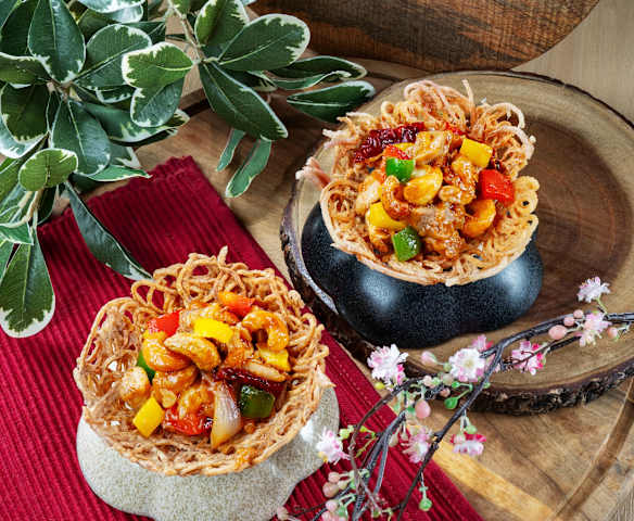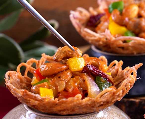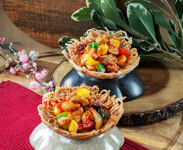 Spiralized Yam Nest with Stir Fried Chicken & Cashew Nut Fillings
