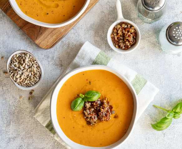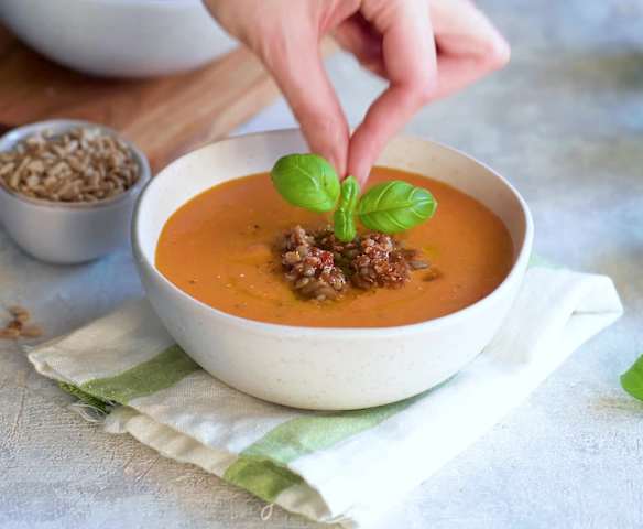 Zupa krem z papryki i suszonych pomidorów z gremolatą