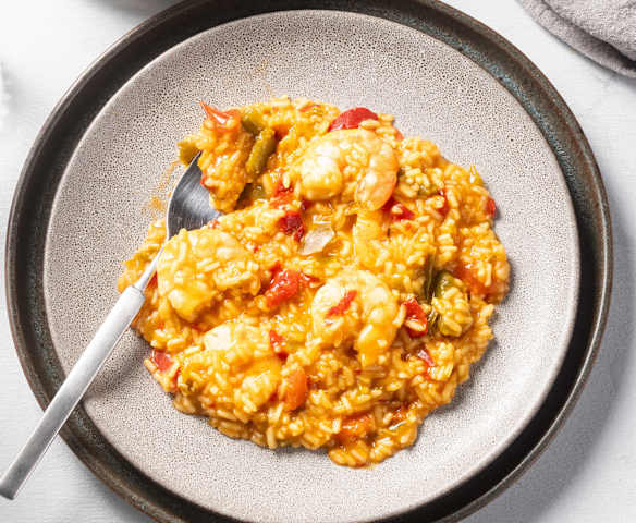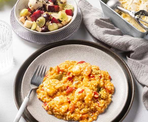 Menu: Riz aux poivrons et scampis, papillote de fruits chauds et glace
