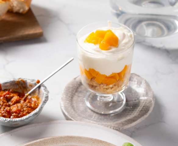 Menu: Steak de thon avec riz et sauce tomate et dessert à base de mangue et de pêche