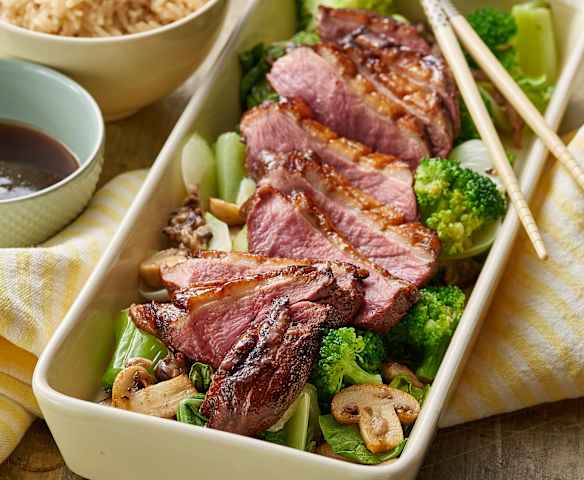 Kaczka w pięciu smakach z grzybami, azjatyckimi warzywami i ryżem