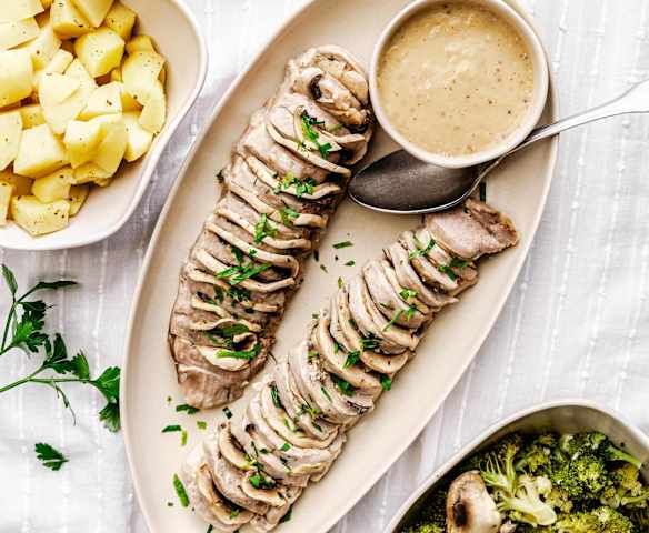 Filet mignon de porc à la moutarde, aux pommes de terre et au brocoli