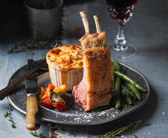 Comber jagnięcy z ratatouille, fasolką szparagową i gratin z ziemniaków