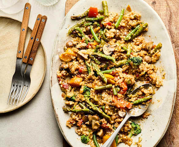 Arroz de cogumelos, espargos e brócolos