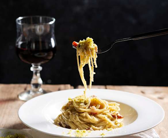 200 g wędzonego wieprzowego podgardla (guanciale), pokrojonego w 1-2 cm kostkęsurowego boczku, bez kości, bez skóry pokrojonego w 1-2 cm kostkę200 g