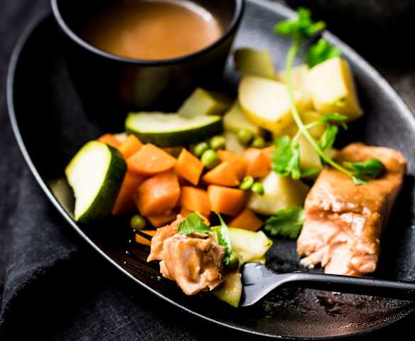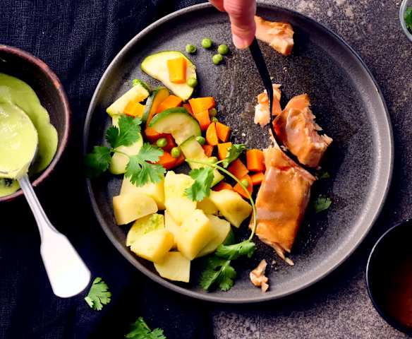 Menu with Ginger-Pea Soup, Lemon Salmon, Broccoli and Potatoes