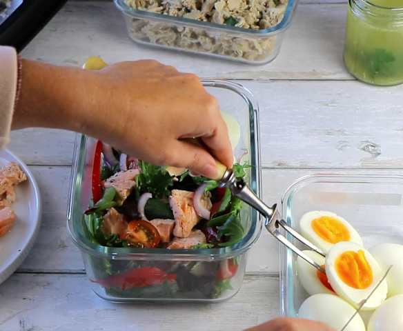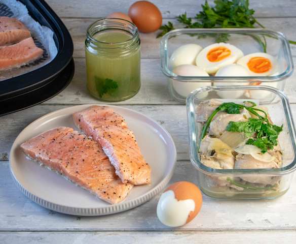 Prep-ahead layered chicken, eggs and salmon