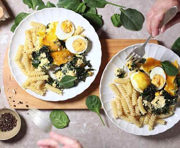 Huevos mollet con espinacas y crema de queso cheddar