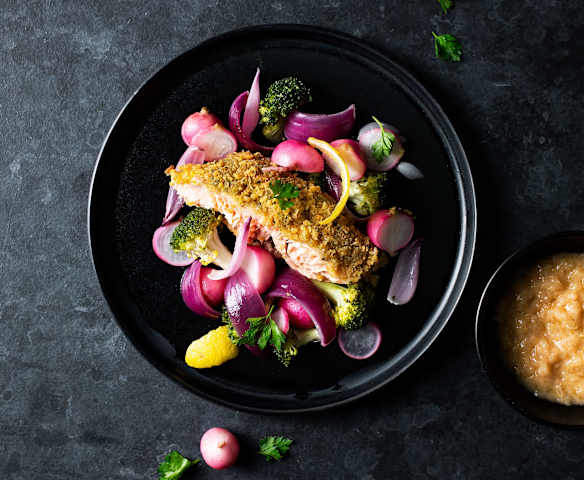 Salmón crujiente con verduras