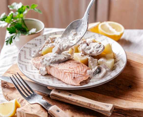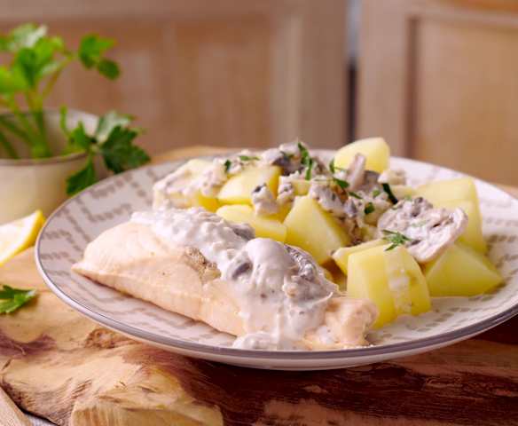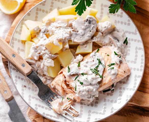 Salmon in Mushroom Cream Sauce with Potatoes