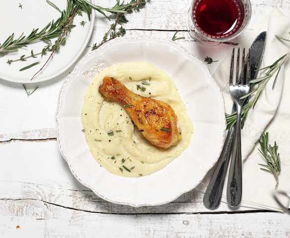 Pernas de frango com mostarda e mel e puré de batata e alho-francês