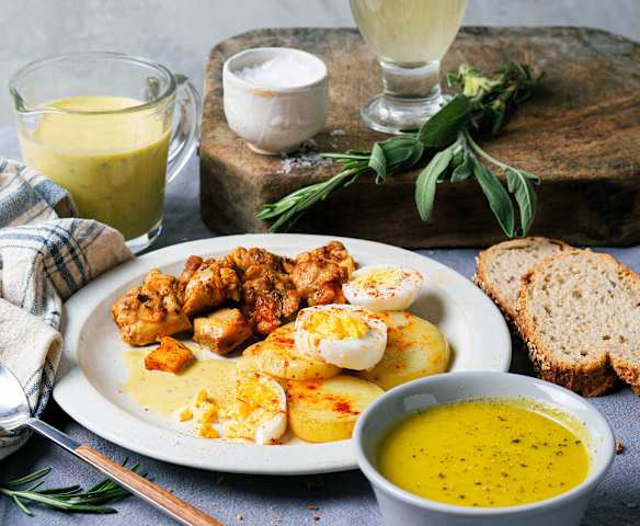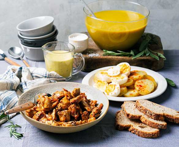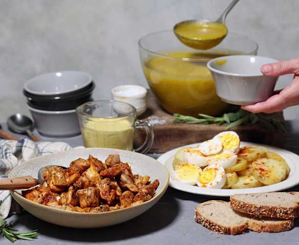 Crema de verduras, pollo en salsa de mostaza con patatas y huevo duro